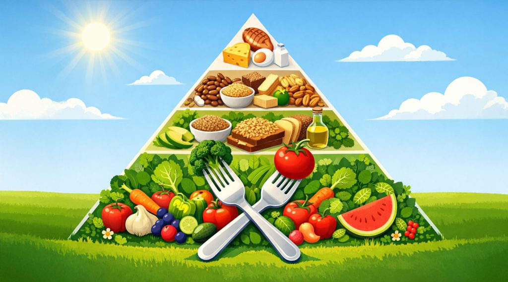 Odwrócona piramida przedstawiająca najnowsze zalecenia żywieniowe Departamentów Zdrowia oraz Rolnictwa USA ...